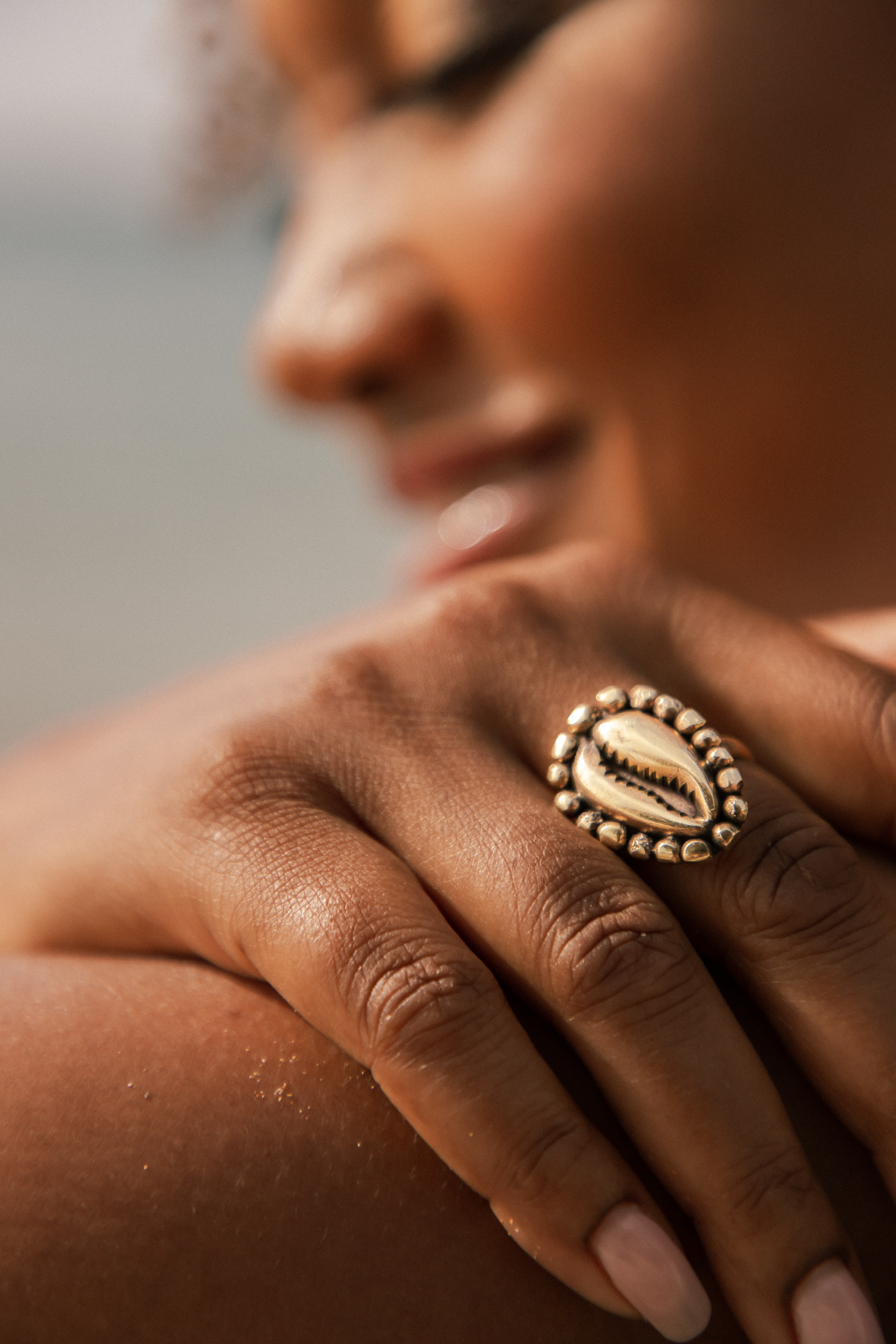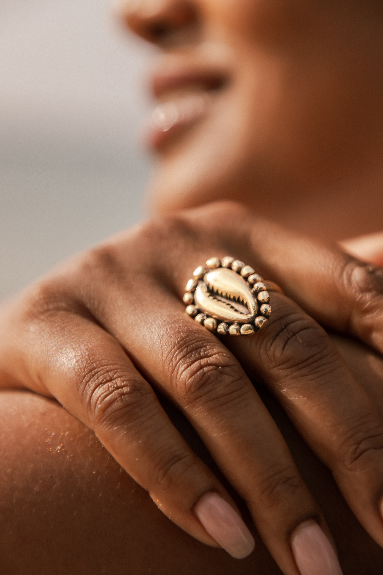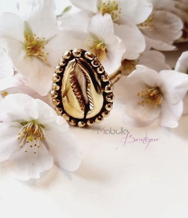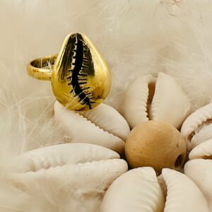 Faites ressortir votre côté girly avec notre bague « La Précieuse ». Cette pièce unique, minutieusement conçue, présente un cauri en bronze, orné par de délicates billes de bronze. Cette alliance des genre, forme une gracieuse fleur. Cette bague est bien plus qu’un simple accessoire, elle est une célébration de la féminité. Le cauri, symbole reconnu de féminité dans de nombreuses cultures africaines, ajoute une profondeur symbolique à cette création élégante. « La Précieuse », est une alliance entre l’art et la symbolique, imaginée pour accentuer votre féminité. En la portant, vous affirmez votre identité de femme, tout en portant une touche élégante et unique à votre tenue.
